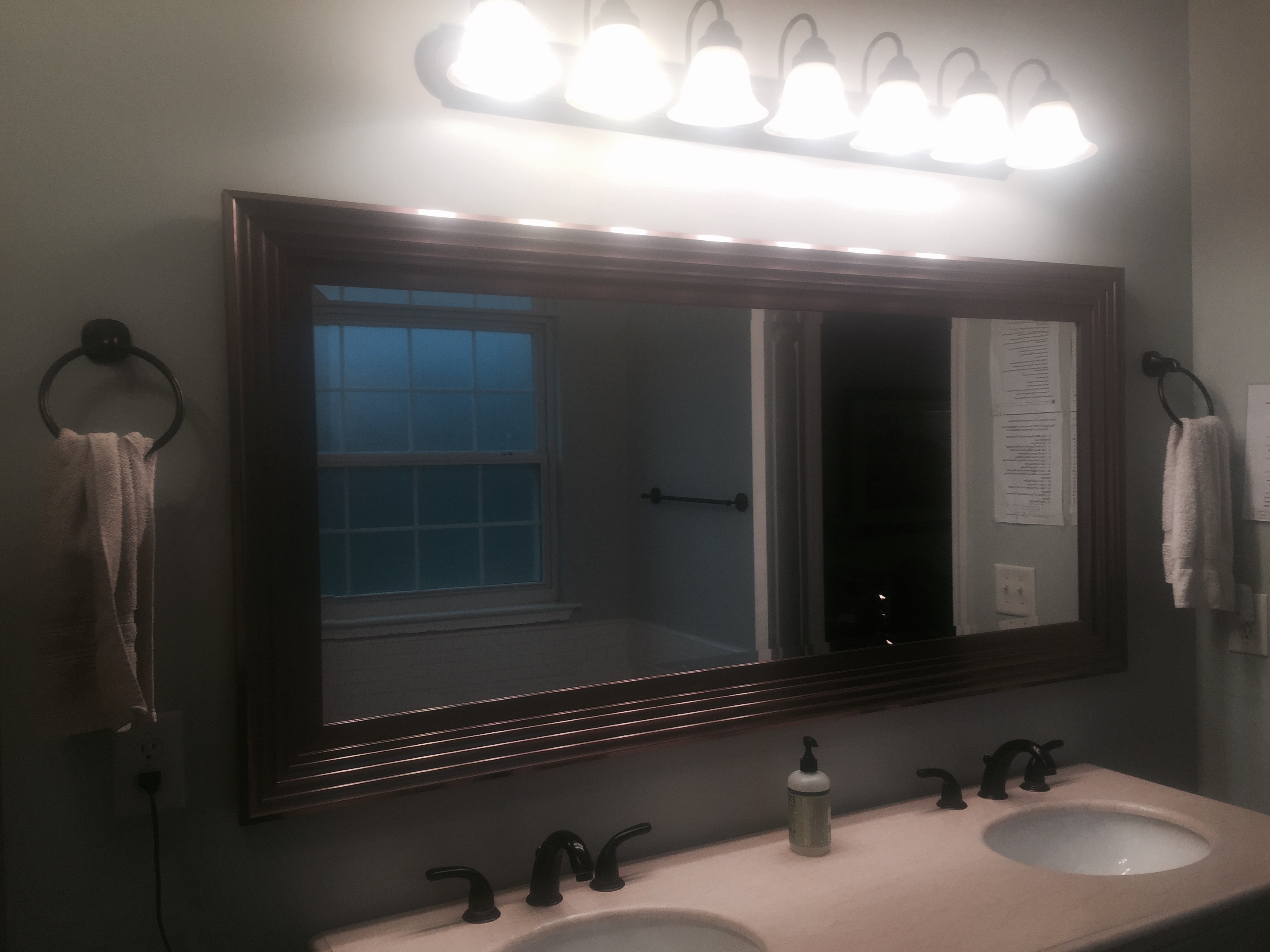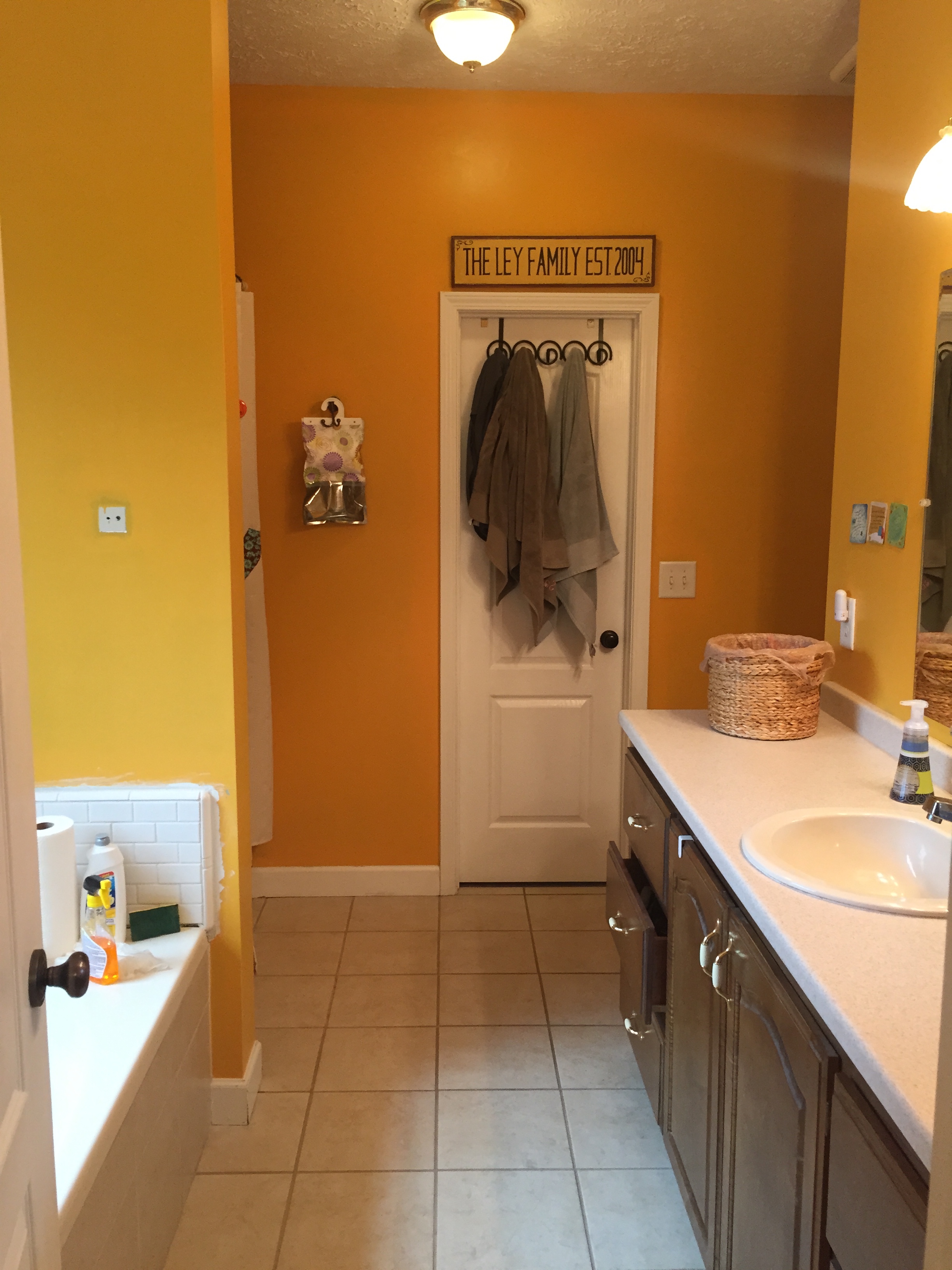 This is a picture of our bathroom “before”. While I personally loved the yellow walls, it definitely is not a color that would appeal to a wide range of buyers. The vanity was the standard builder cabinet that came with the house, and although the counter has the space for two sinks, there was only one. Notice the uninspired lighting over the sink and in the ceiling. Not very spa-like. The tub backsplash is the one recently installed thing in this picture (white subway tile, which is very on trend)- unfortunately I couldn’t find a picture of the bathroom before; the back splash used to be the same tile that is on the floors.