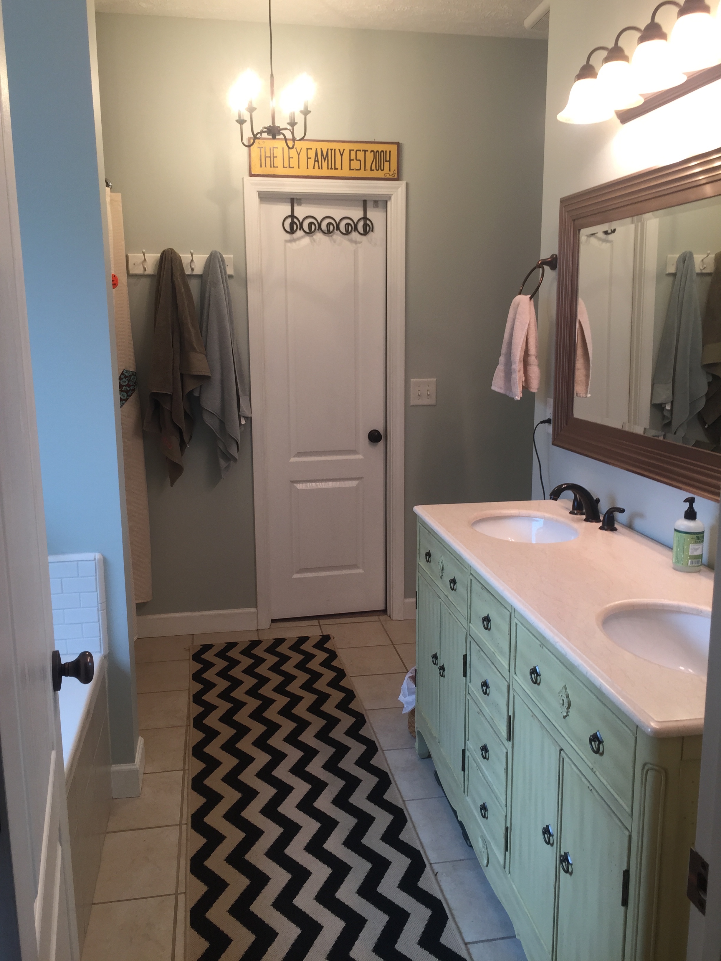 After: We painted the walls a lovely gray/blue, added a cute chandelier, new marble topped double vanity with oil rubbed bronze faucets, new mirror, new over the sink lighting (lots of light in this bathroom!), new oil rubbed bronze hand towel holders, new chevron floor runner, new towel hooks, cute glass shelf, and new recessed toilet paper holder. And a partridge in a pear tree! Just the place I’d like to relax and unwind after the holidays..or any day.