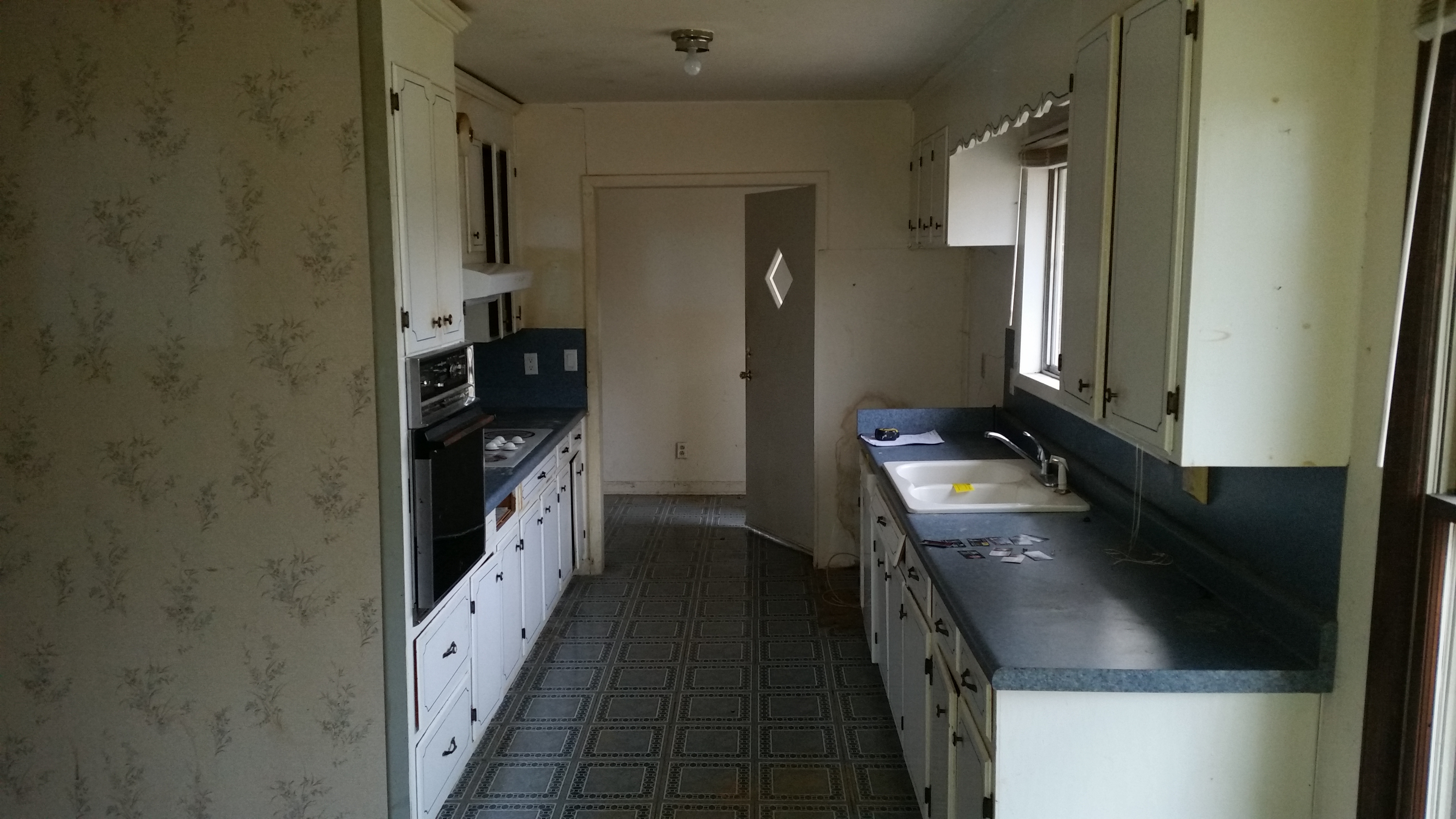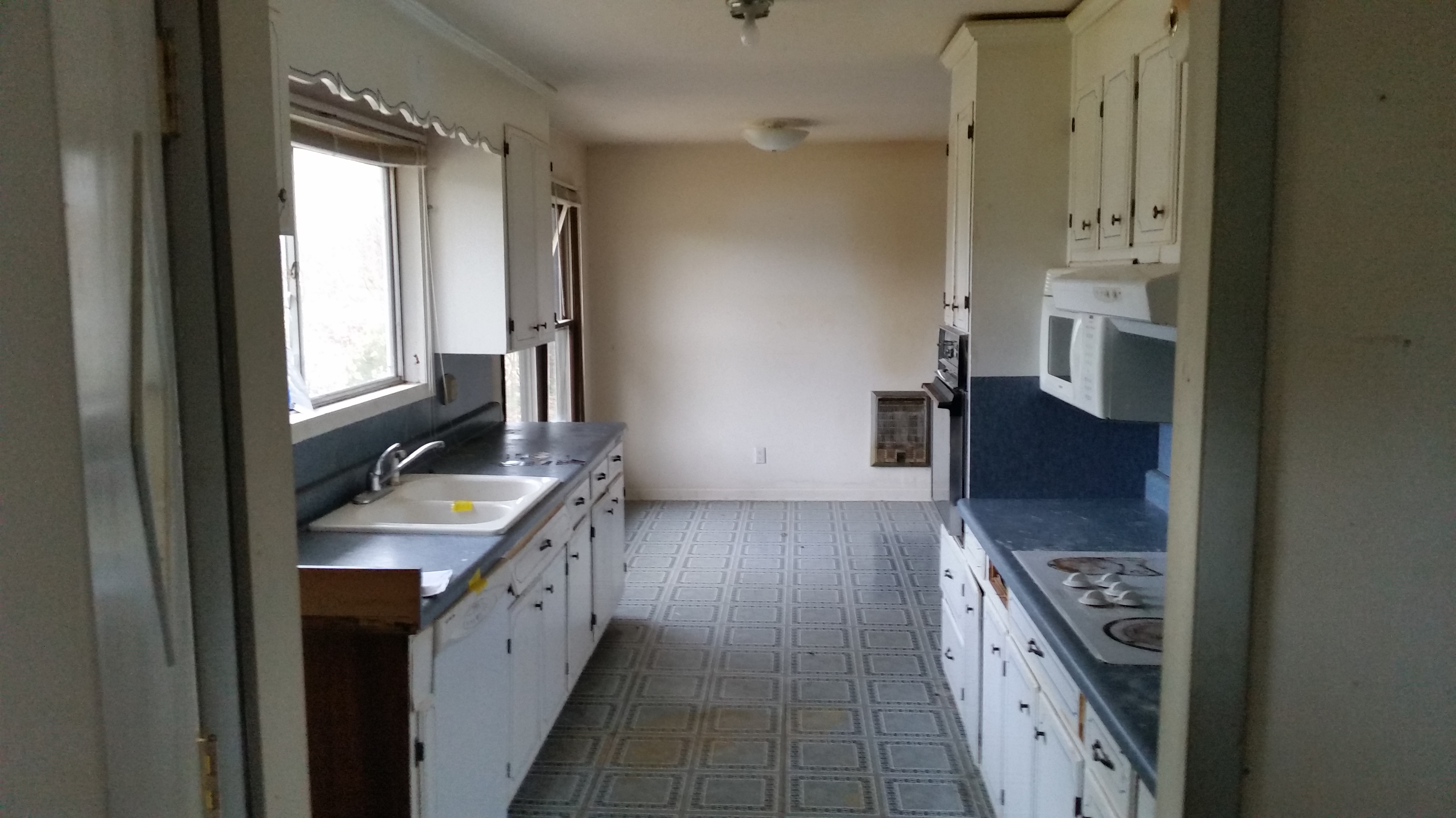 Above are all pictures of the kitchen before. It was a nightmare. Smelly, dirty, and falling apart. Notice in the third picture there is a wall where a line of cabinets was along with the microwave and oven. We knew as soon as we walked into the house that it would have to go and that a great big old island was exactly what needed to be there instead to open up the floor plan.