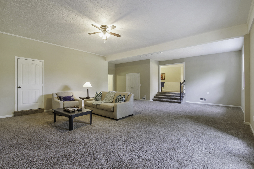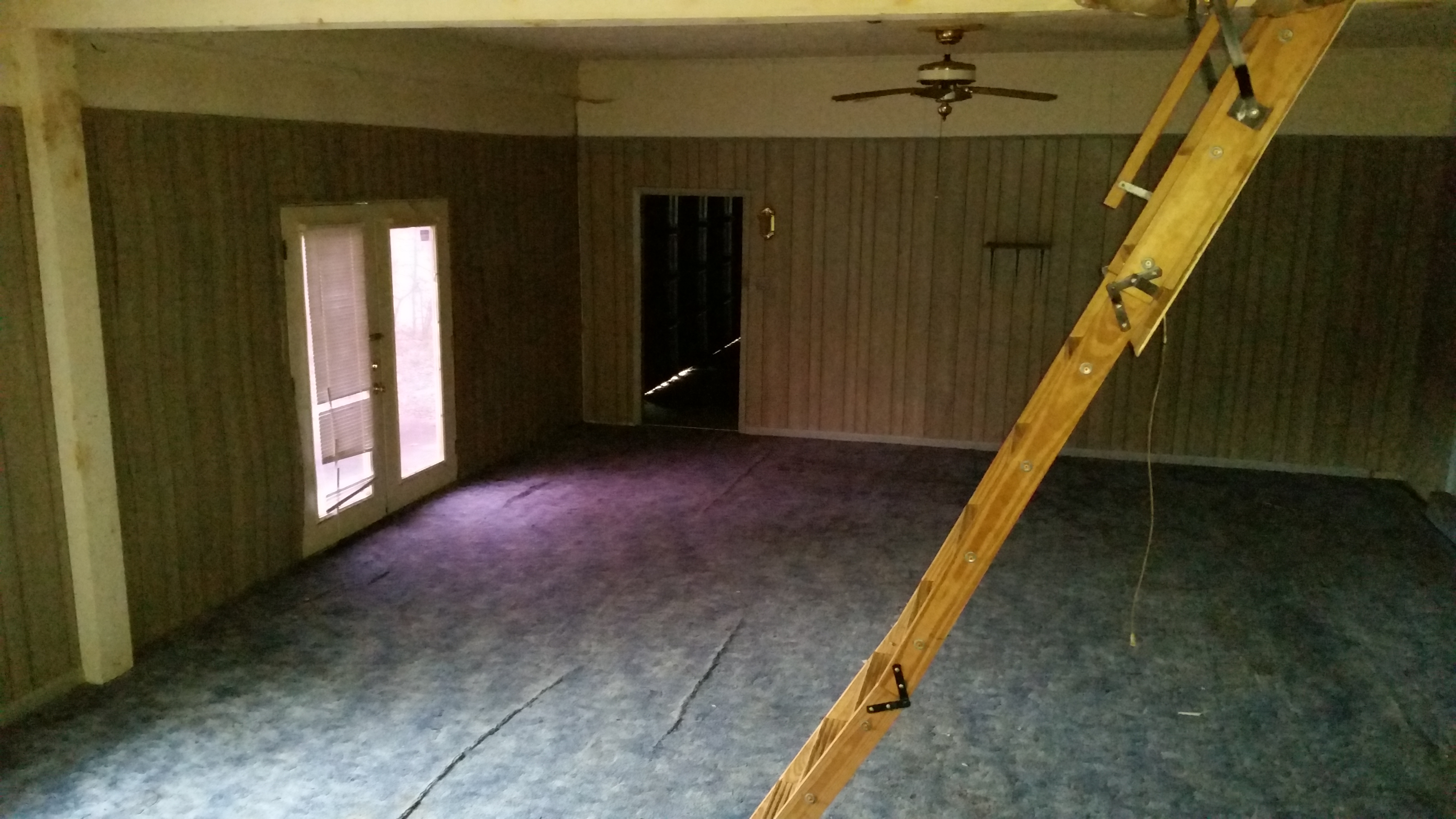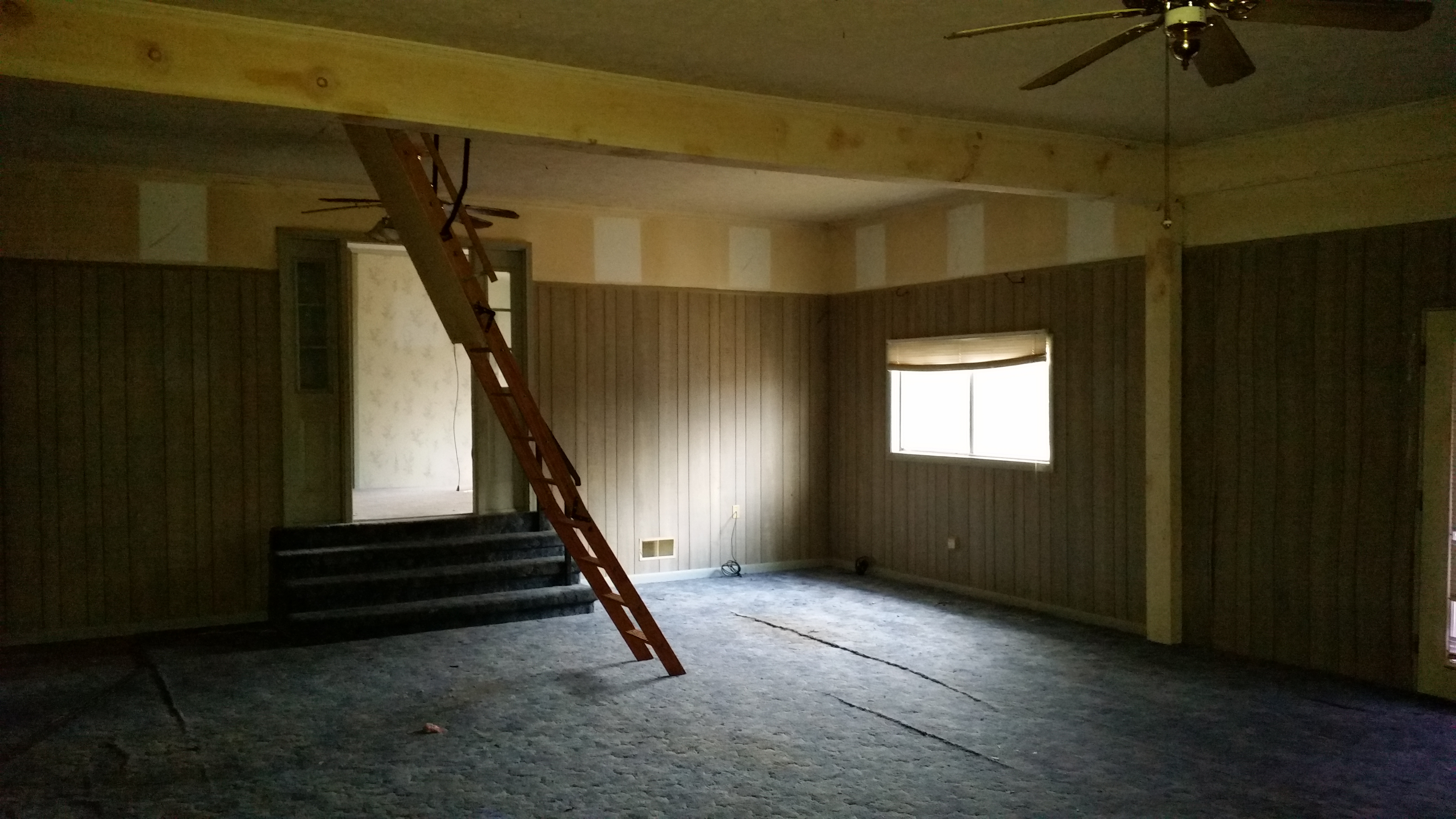 This is a HUGE living area, which sported old dirty blue carpeting before, along with peeling wall paneling.