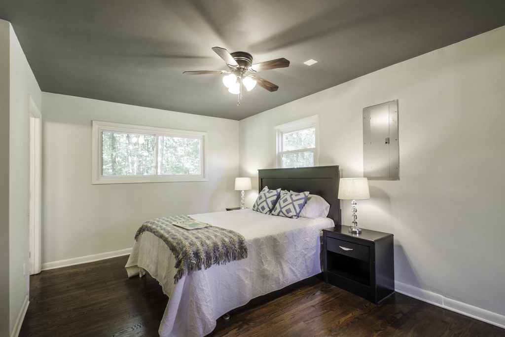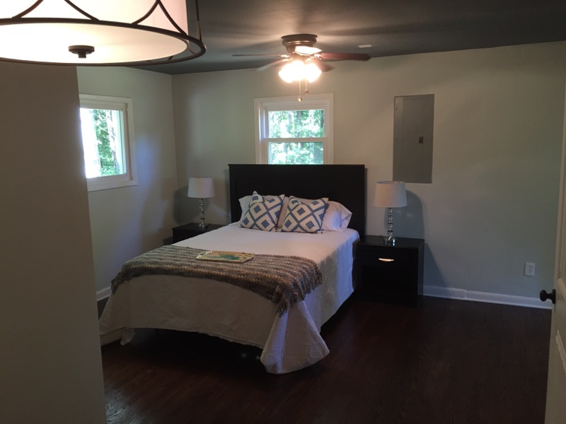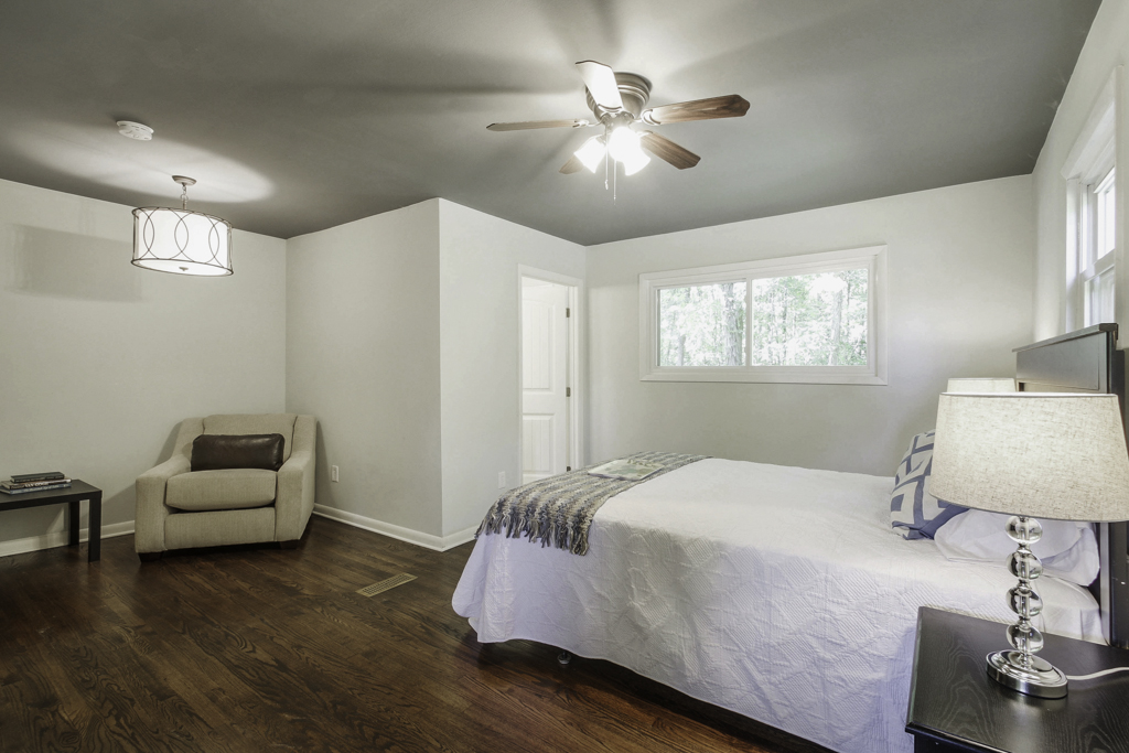 These are all differently angled pictures of the master bedroom above. I love the unique sitting area. The private wooded backyard, lighting, and freshly, gleaming, refinished hardwood floors are all the stars here. Along with my staging of course.
