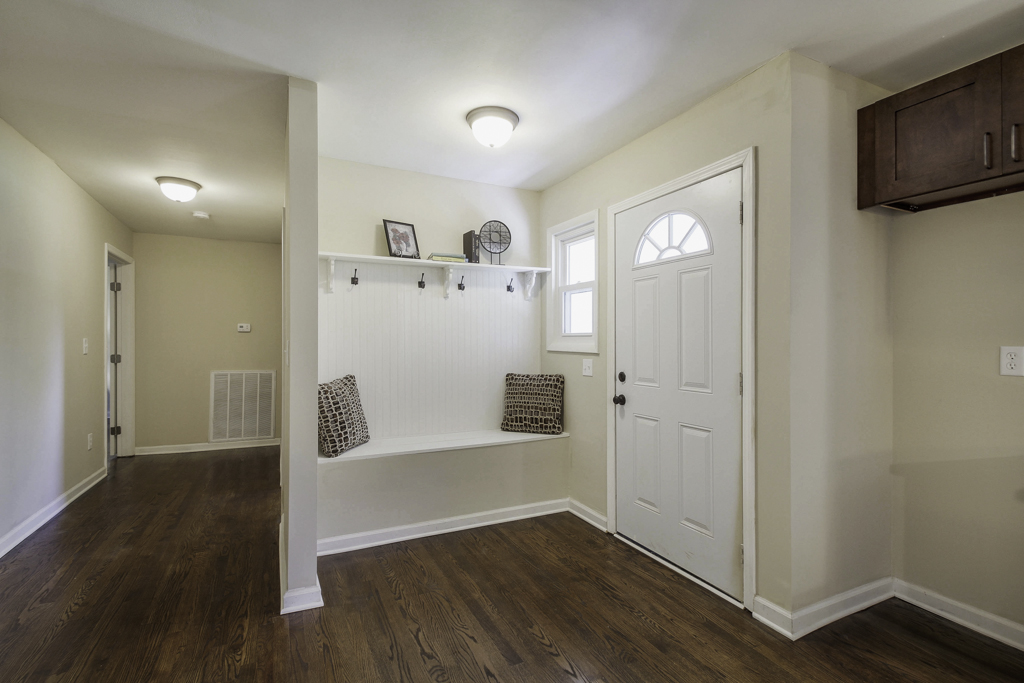 An adorable little entry way bench/shelf/hook area to hang coats, hats, and backpacks.