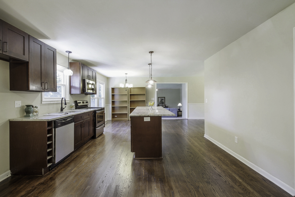 After. Gone are the heaters, replaced with a new big hvac unit, gleaming hardwoods, and pretty fixtures make it pretty. And the staging sets the stage. Also, now that the wall is down, it is no longer separated from the kitchen.