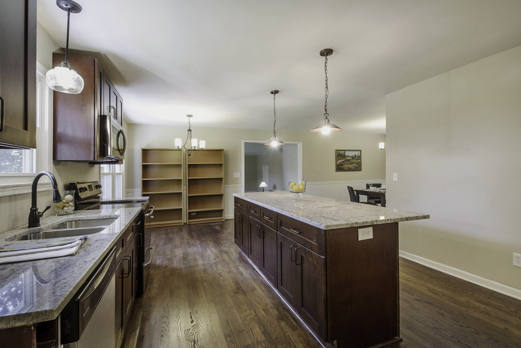Bam! I love it. When you’re right, you’re right; taking out the wall made a huge difference. We had some major scores with this kitchen. For instance, with granite there are 3 tiers to pricing and quality. Level 1 is builder grade, and it is the least expensive. Level 2 is mid grade, and level 3 is the exotic granite, the most expensive. This granite is level 3, white ice. It is sparkly and gorgeous- I am jealous of this granite and it is throughout this home! It’s not only in the kitchen, but also in every bath. We got majorly lucky and got it for the builder grade price due to some yellowish veining running through it that made it impossible to market as true white ice. They only had 3 slabs at the granite yard, and we got all 3. Major score.
