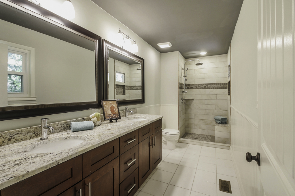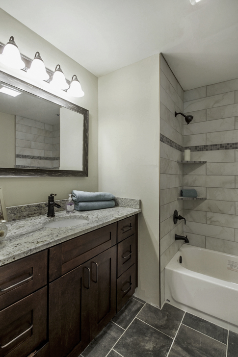 After, we changed it into a gleaming full bath, along with that granite and custom tile work, and now it’s beautiful!