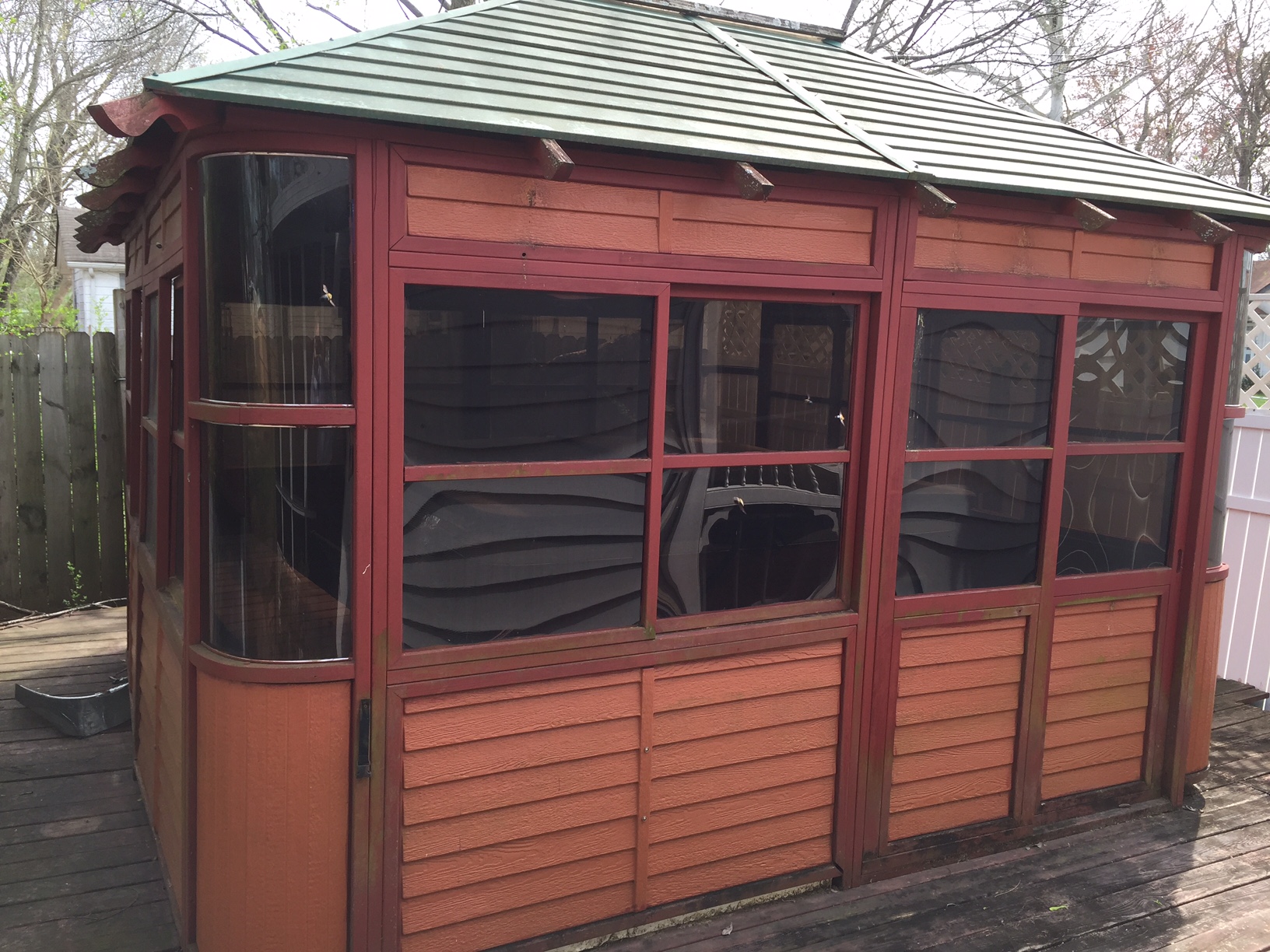 (Death Trap gazebo/home to a giant bees nest full of angry bees. Not very relaxing). This was completely taken away, decking and all.