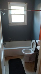 I don’t have a before picture, but it was an empty room with plywood subfloor and dirty paneling. No shower, toilet, lighting, or sink vanities.