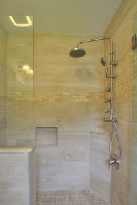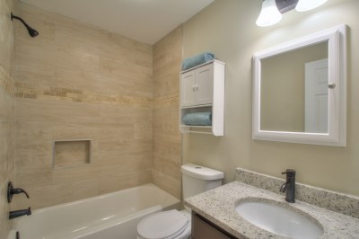 The shampoo niche, wall cabinet, cabinet style vanity, and recessed medicine cabinet help add much needed storage in this small bathroom.